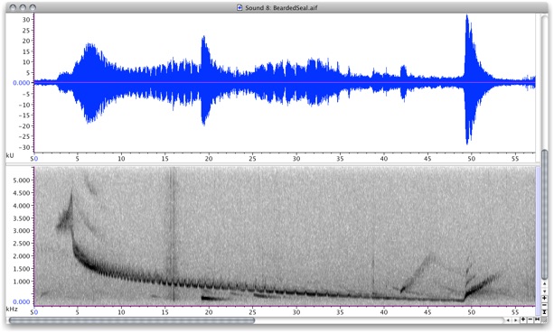 Audio clip, waveform display and sonogram of a bearded seal vocalization
